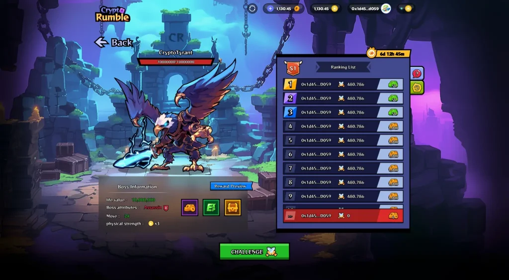 游戏中,玩家需要在 3 分钟的限制内,玩家根据对 BOSS 造成的伤害进行竞争,时间结束时,对BOSS造成伤害较大的玩家获胜。获胜者将获得赌注金额的 90%,而平台将收取 10% 的费用,同时获胜者还将获得额外的 PK 奖励 $CR。