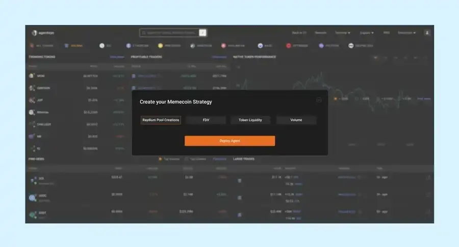 解决方案:想象一下一个 MEME 币筛选器(类似 @birdeye_so),你可以筛选代币并输入指标——然后一个 AI Agent 根据选择的策略自主执行交易。