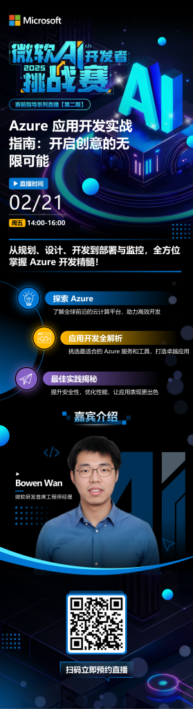 本次直播不仅适用于挑战赛参赛者,也适合所有希望深入了解 Azure 应用开发的开发者和技术爱好者。无论你是初学者还是经验丰富的开发者,都能在这里找到灵感和实用技巧!2月21日,我们不见不散!