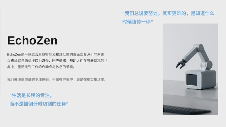 他们最终提交的硬件产品 Echozen,是一款专为 ADHD(注意力缺陷多动障碍)人群设计的桌面式专注引导系统。在实际应用场景中,Echozen能实时监测用户的脑电波与微表情,当检测到专注力下降时,机械臂轻推水杯提醒休息,或语音建议调整状态,能科学安排专注-休息周期,帮助ADHD人群循序渐进提升专注力。